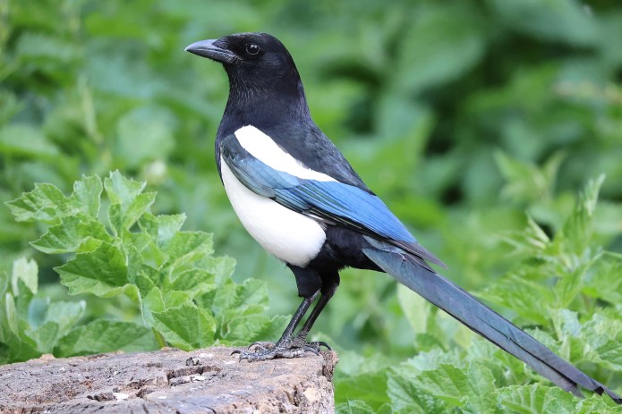 A magpie looks much bigger than it is: the tail makes up half the bird’s length. Its average weight is only about half that of a wood pigeon’s