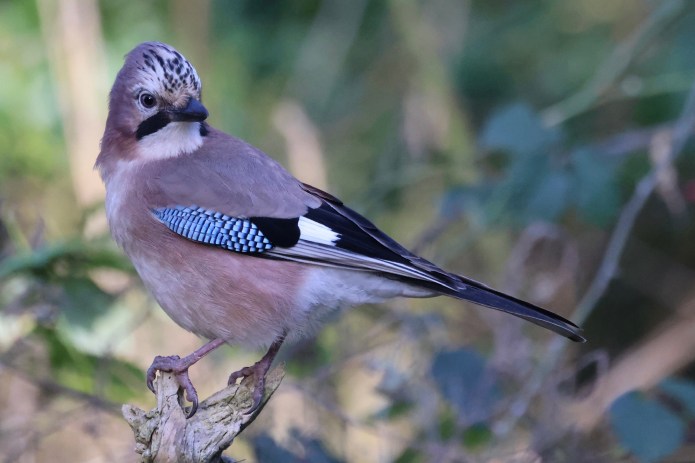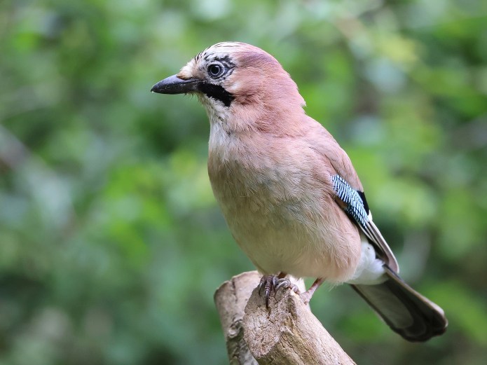 You’re likely to hear a jay before you see it – it has a characteristic ‘screeching’ call. It’s also a skilled mimic, sometimes copying the songs and calls of other birds. The jay has pale pink plumage, a black tail and white rump. Its head has a pale crown with black streaks, and black facial markings and bill. Its wings are black and white with a panel of distinctive electric-blue feathers. It has a wingspan of around 55cm and is 35cm from tail to beak. Average weight is between 140 – 180g .